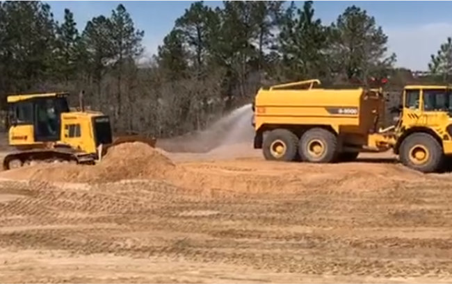 在美國南卡羅萊納州的一處大型房產建設工程,此工程對地基平面度要求精度極高,卡車、推土機、壓路機、工程灑水車等多機種協同作業,山推DH13K全液壓推土機擔任土方運移和精細化平整作業。
